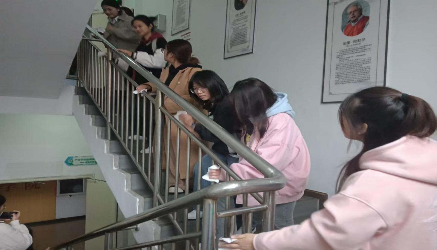 楼梯间里,同学们拿着抹布和纸巾,仔细清理着楼梯台阶和扶手。他们耐心地擦拭着每一处污渍,清扫着每一粒灰尘,让楼梯间变得干净明亮