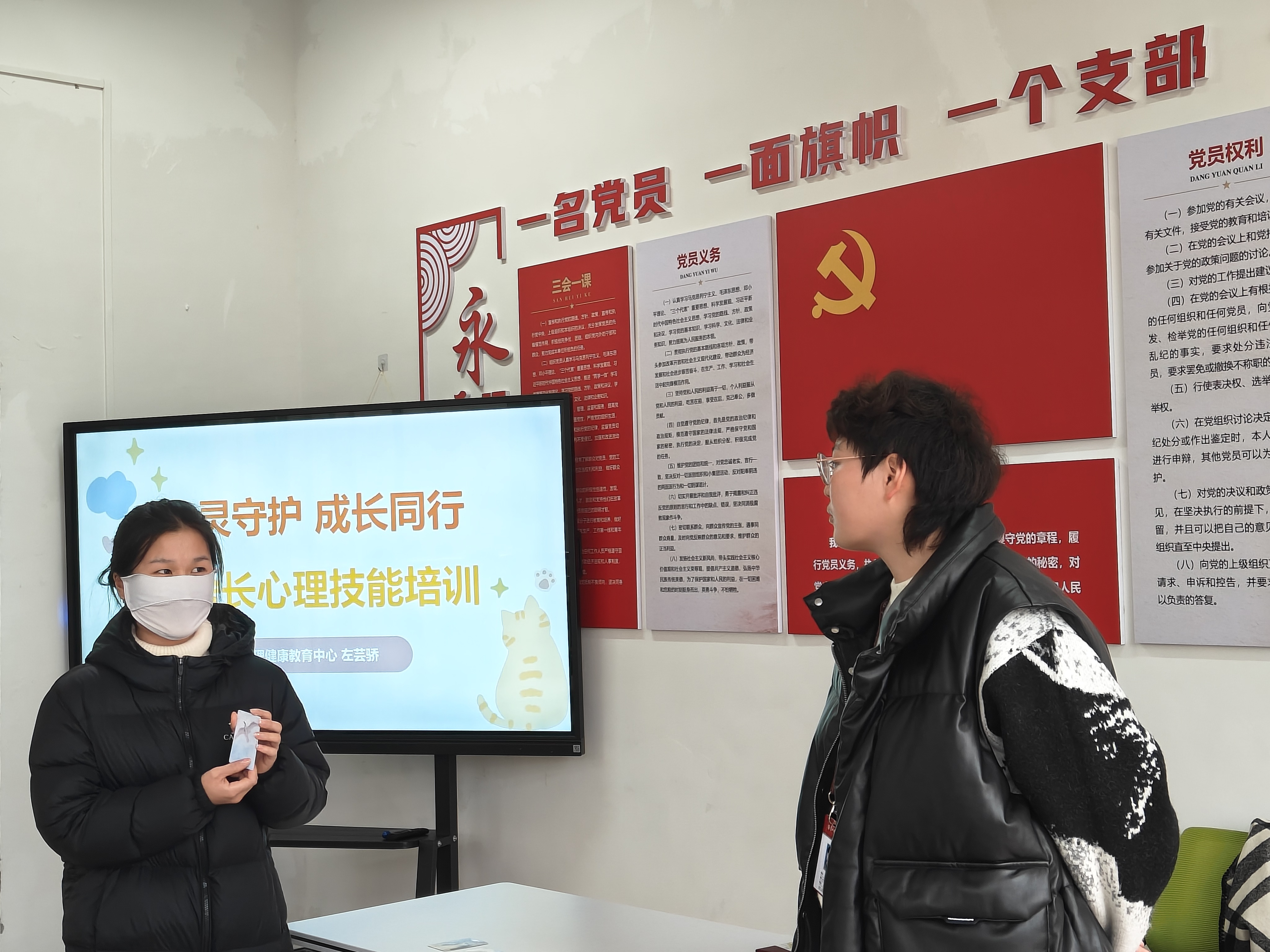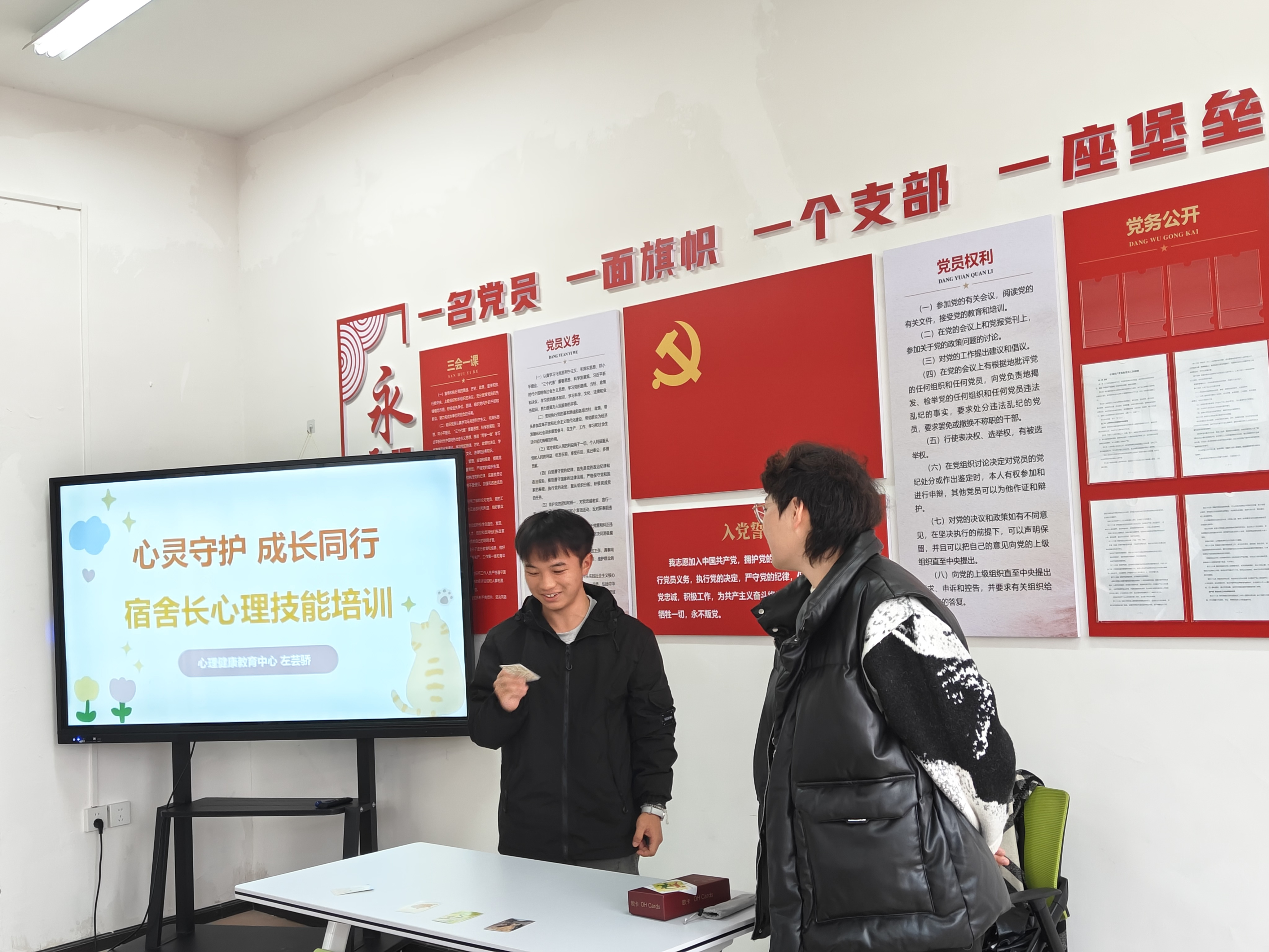 “面对同学的倾诉,‘我懂你’比‘你要坚强’更有力量。”在互动教学环节,左芸骄老师聚焦“有效倾听”技巧,组织宿舍长开展“角色扮演”活动,模拟“同学学业受挫情绪低落”“人际矛盾产生心理隔阂”等常见场景,现场指导大家运用“共情回应”“非评判性表达”等方法,搭建情感沟通的“连心桥”。针对宿舍长提出的“如何劝说心理困惑同学寻求专业帮助”这一难题,她详细解读了“尊重意愿、温和引导、及时报告”的转介原则,并公布了学校24小时心理援助热线及学校心理健康中心咨询的预约方式。