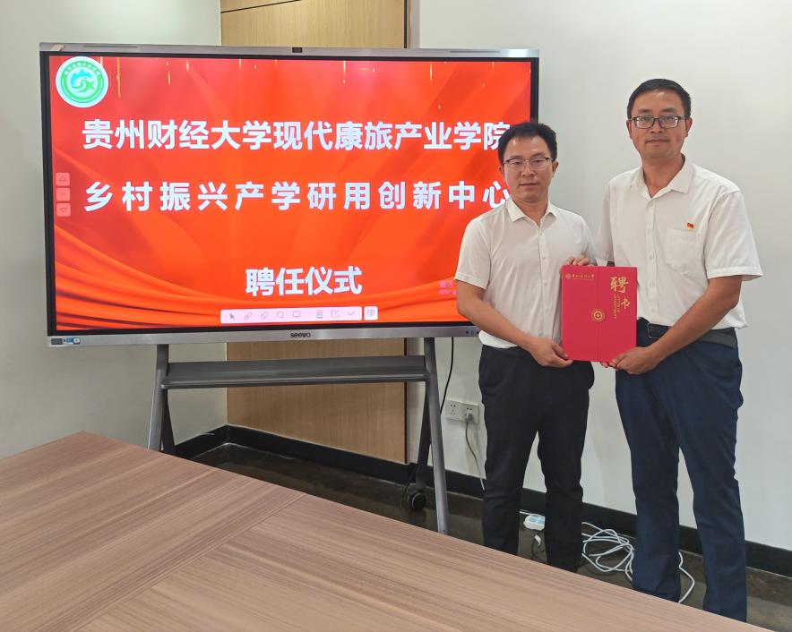 为发挥财经类高校专业学科优势,赋能西部地区推进乡村全面振兴,更好地服务地方经济社会发展,贵州财经大学现代康旅产业学院于2025年9月3日成立乡村振兴产学研用创新中心,并在崇德楼会议室举行首届中心主任聘任仪式。