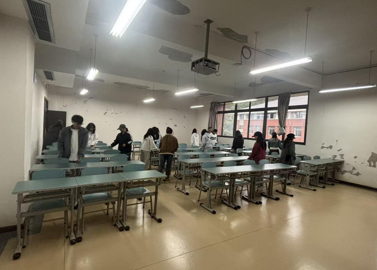 教室内,同学们也忙碌起来。大家齐心协力整理桌椅,将其摆放得整整齐齐;同时认真清扫地面,擦拭黑板,让教室焕然一新,为接下来的教学活动营造了舒适的环境。